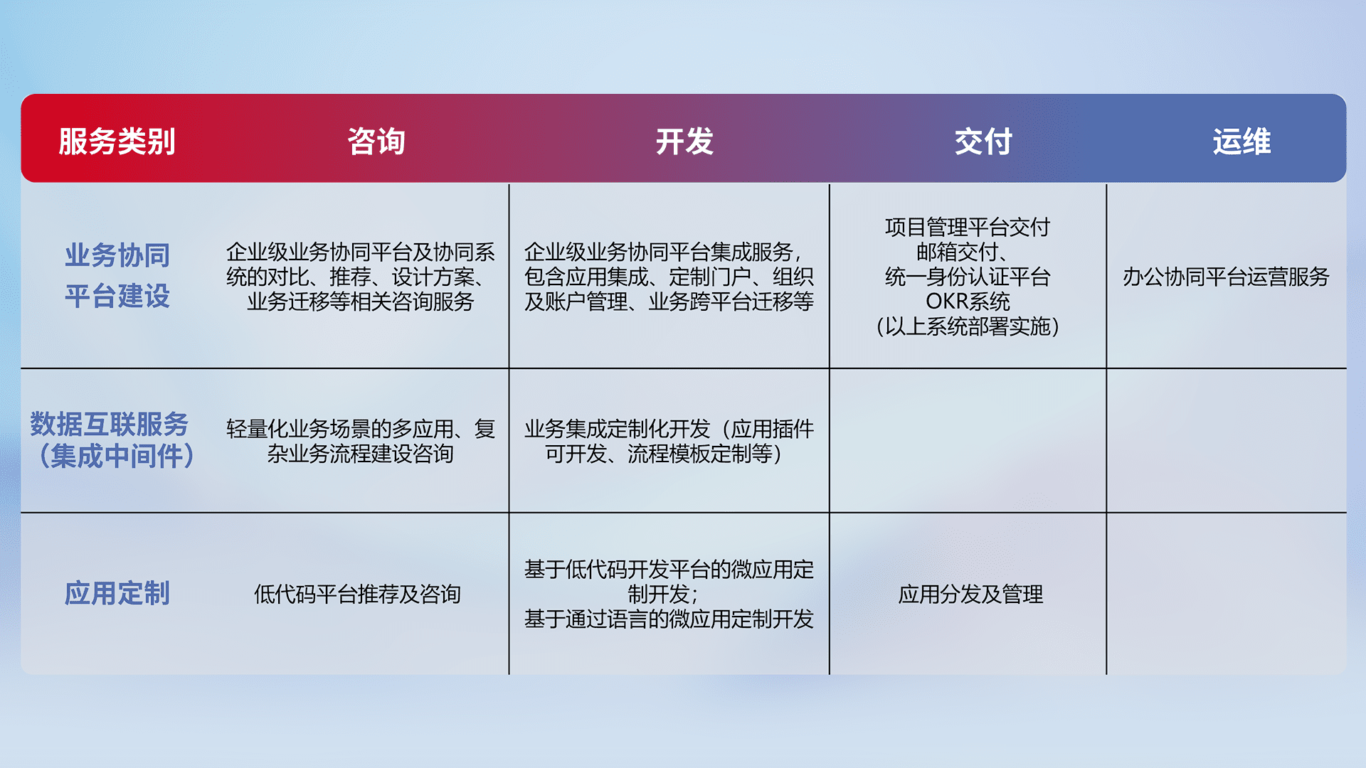 针对钉钉、、、企微、、IDaas等平台级产品提供产品的规划、、、、方案、、、、交付、、、定制化开发等服务,,实现如统一协同办公、、智能客户服务、、、混合会议管理、、、智能数据查询、、、等业务场景,,,,实现数字化转型。。