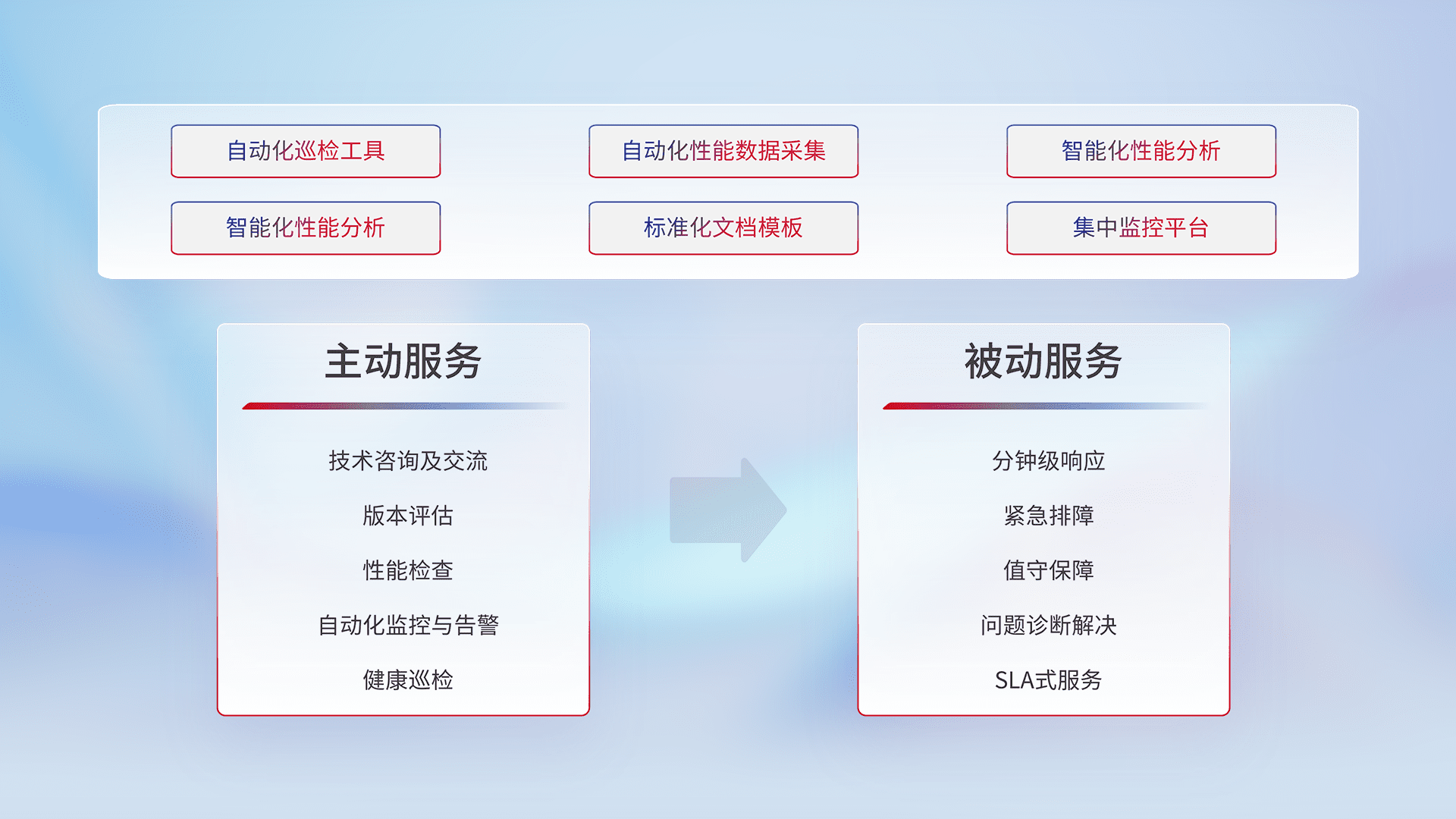 智能化工具和标准化文档,,保障服务质量,,,,提供主动服务(包含技术咨询、、、版本评估、、、、性能检查、、、、自动化监控与告警、、、健康巡检)和被动服务包含(分钟级响应、、、、紧急排障、、、、值守保障、、、问题诊断解决、、、SLA服务)。。